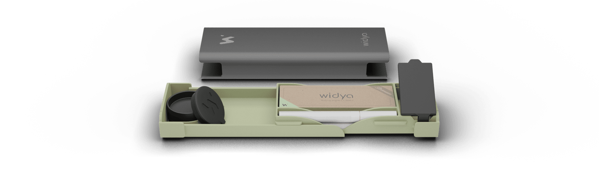 Widya can hold medium-sized rolling papers, two standard cigarettes or prerolls, herbs & its grinder, with additional herb storage inside.